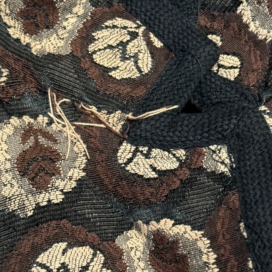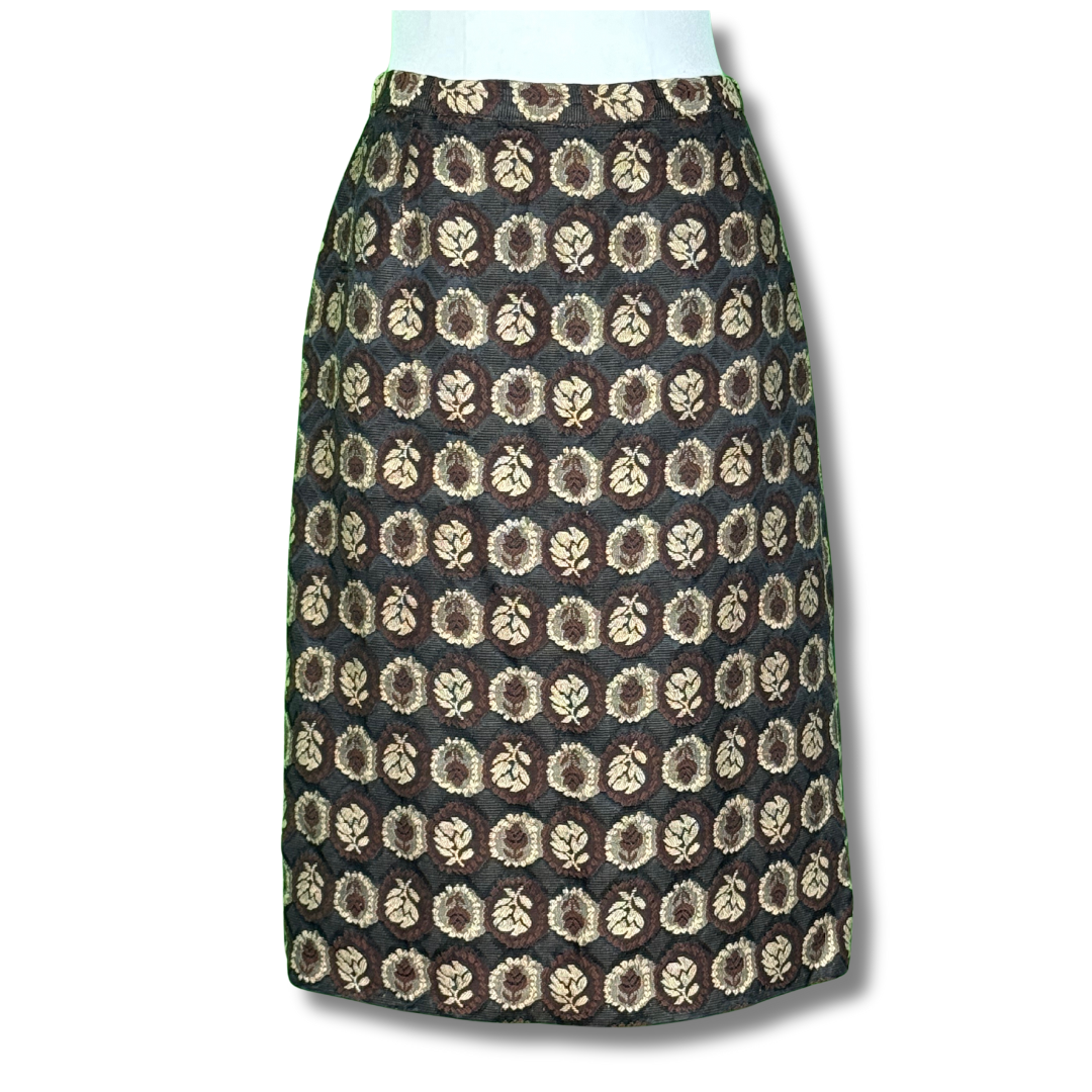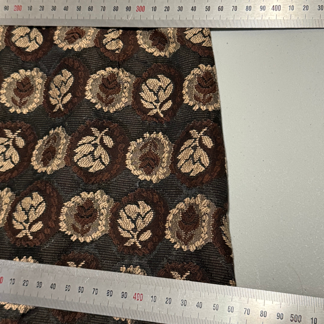 This vintage 1950s evening jacket and skirt suit by Gloria Swanson features a stunning black and brown floral tapestry fabric that has a lightweight texture. The unlined design adds to the elegant aesthetic, while the cropped dinner jacket, adorned with black cord trim, hits at the waist for a flattering look.Closes in front with some big buttons.