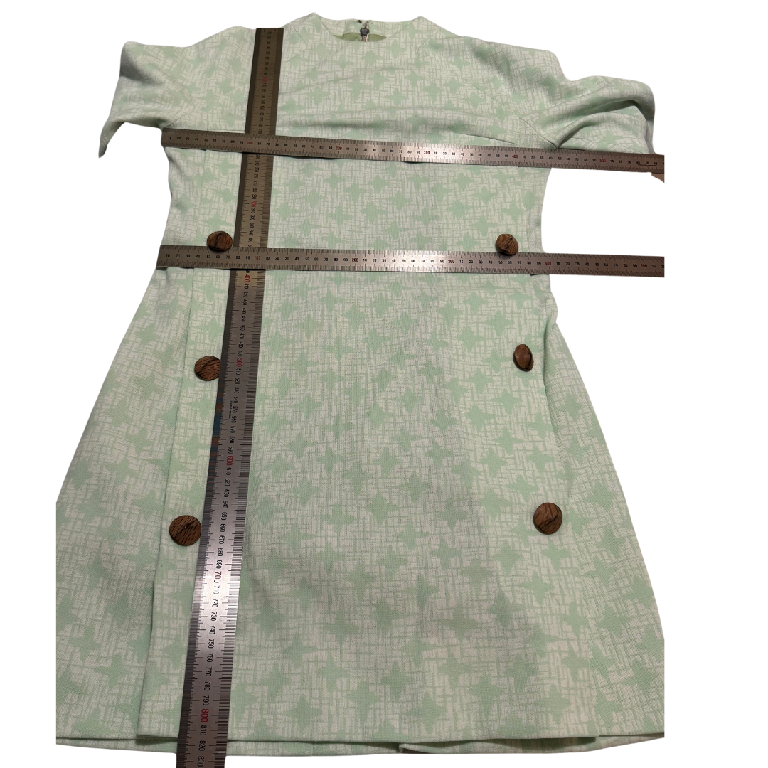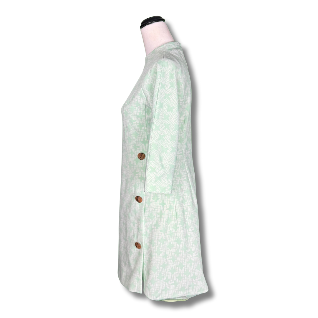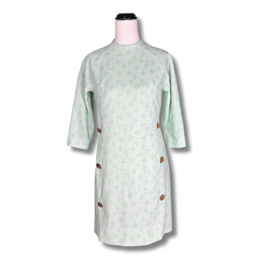 This 1960s vintage mini dress features a white pattern with subtle pale green abstract stars and elbow-length sleeves. Three vintage buttons adorn each side of the front, while a high round neck offers timeless elegance.