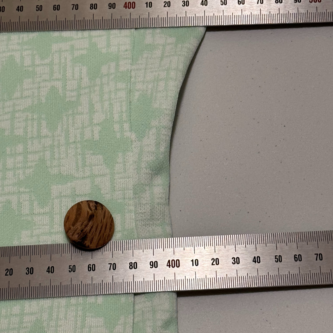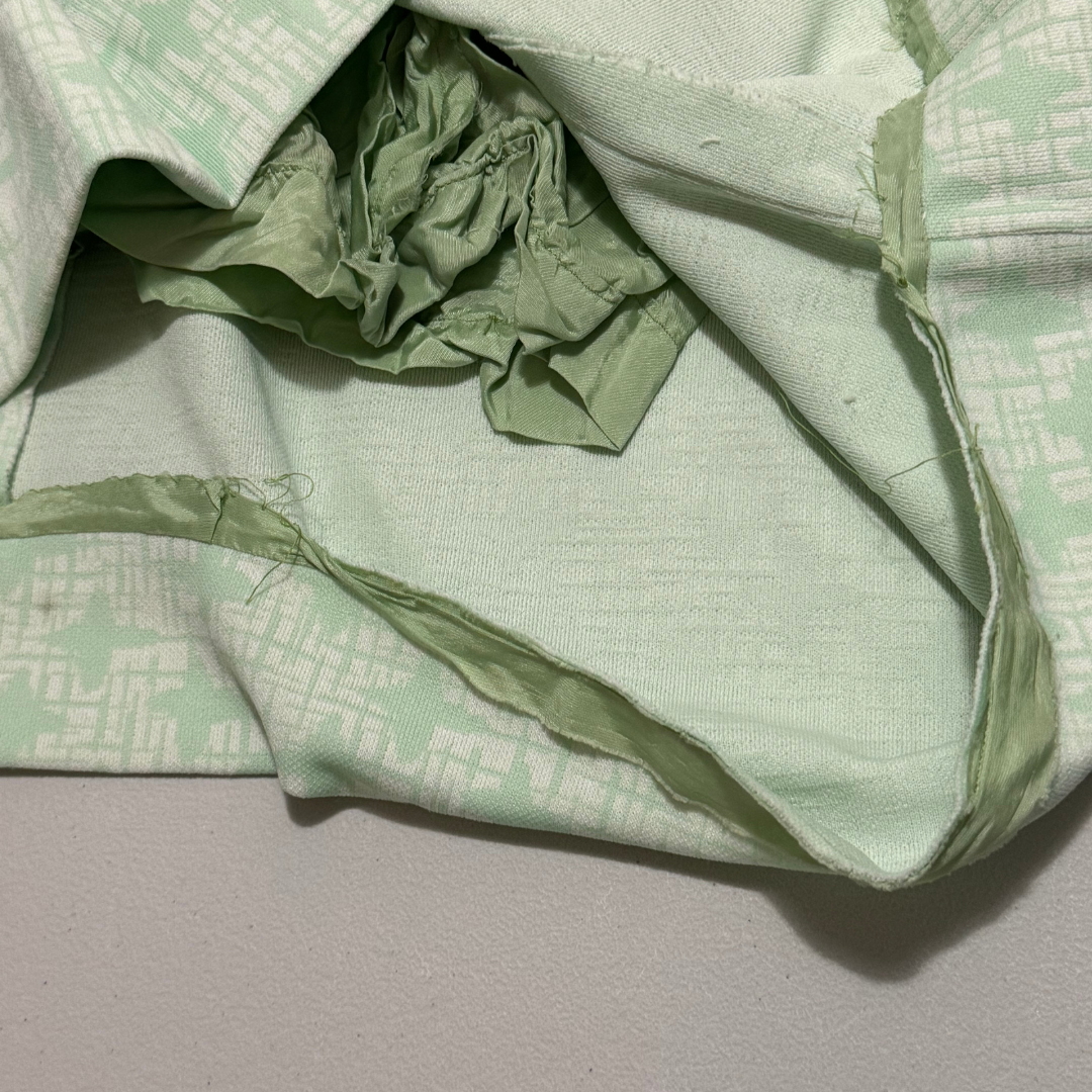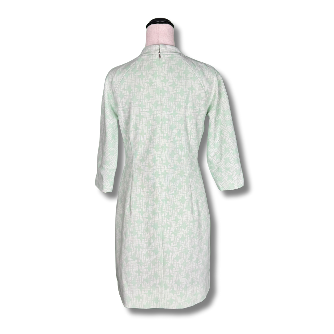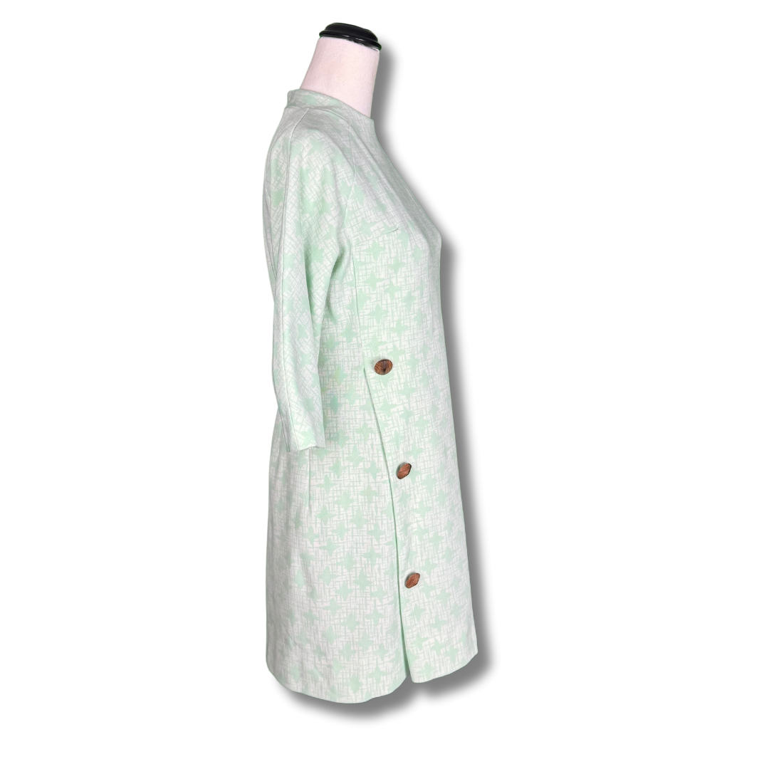 This 1960s vintage mini dress features a white pattern with subtle pale green abstract stars and elbow-length sleeves. Three vintage buttons adorn each side of the front, while a high round neck offers timeless elegance.