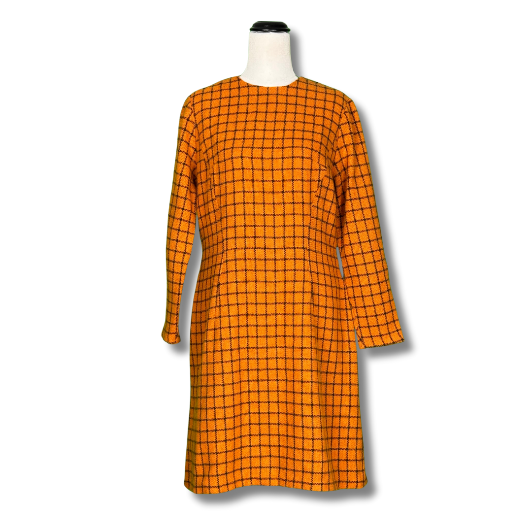 This 1960s shift dress features an orange checkered pattern with long sleeves and a beautiful A-line silhouette. The orange and black stripes intersect to create a stylish and groovy grid design.