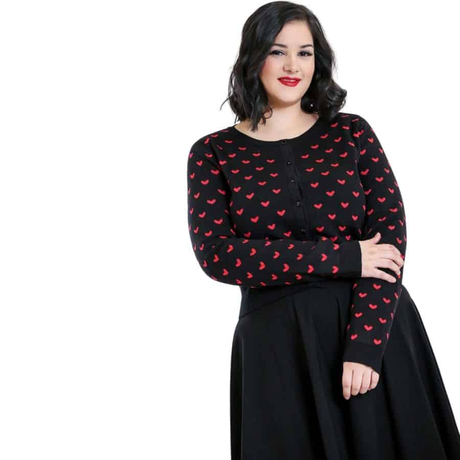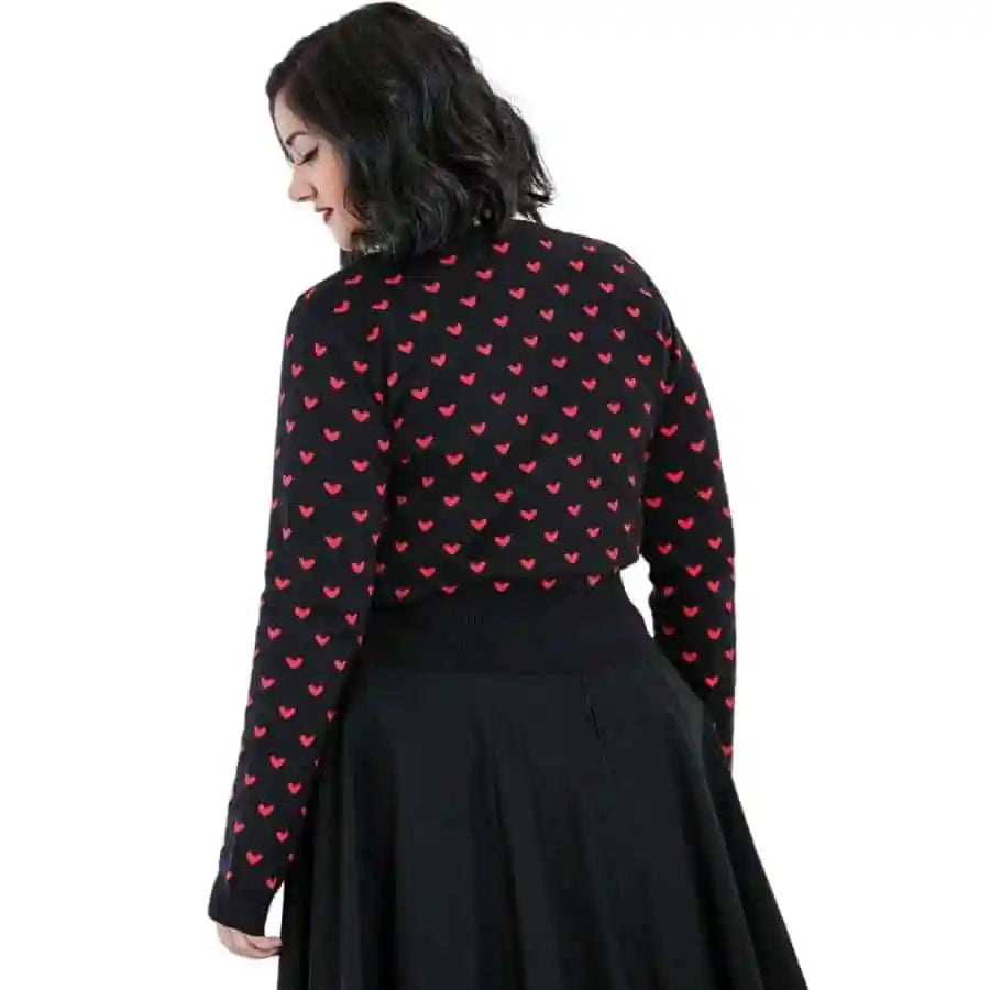 The Corazon Cardigan in Black by Hell Bunny is the perfect pretty cardi. Its striking red sparkly hearts jacquard design adds a playful touch to your look, while the cropped silhouette exudes modern sophistication. With ribbed cuffs, hem, neckline, and button stand, this cardigan is as elegant as it is cozy. Whether layered over a dress or paired with your favorite jeans, it's sure to become a staple in your wardrobe. Experience comfort and style like never before with the Corazon Cardigan.
