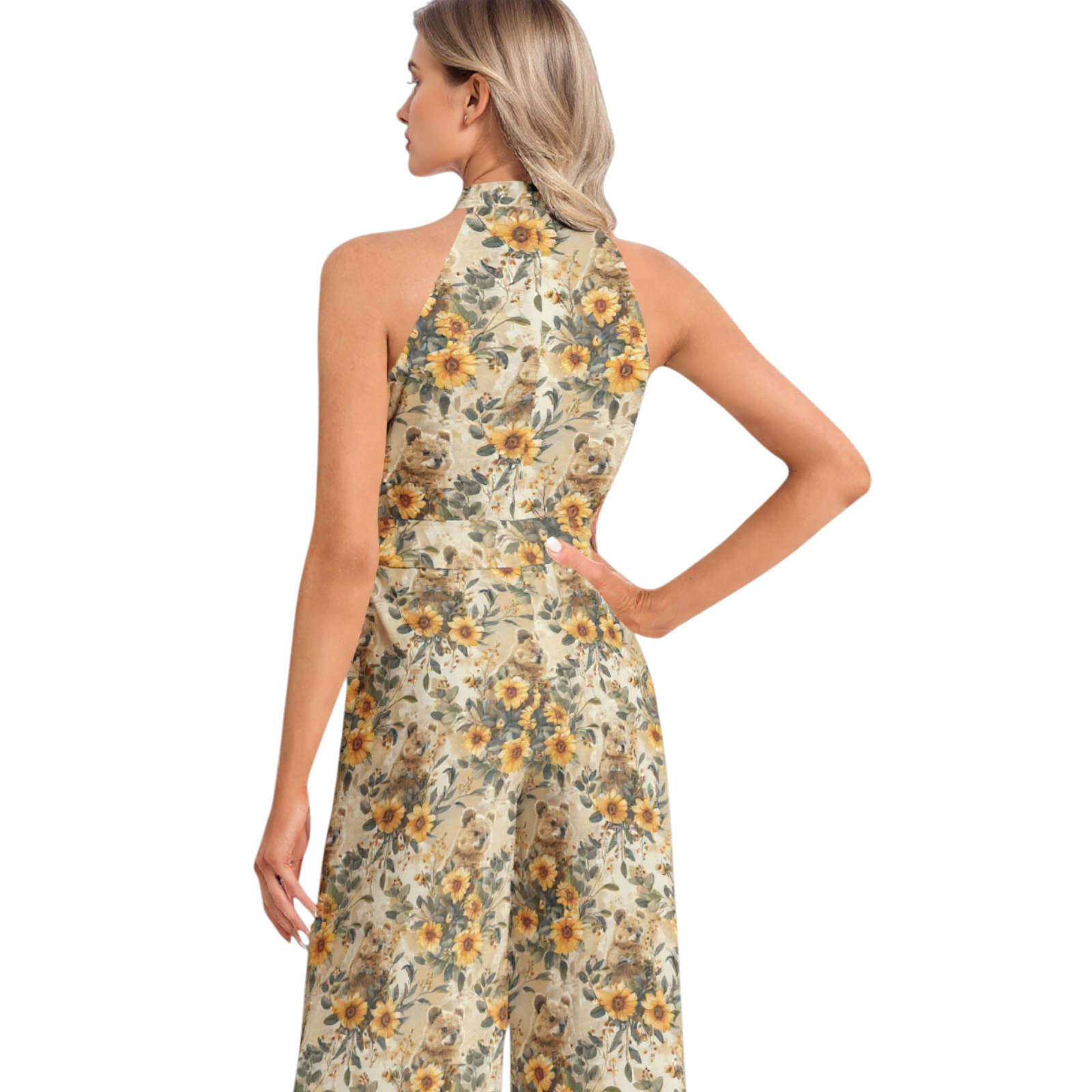 She’s the one who walks into the room and suddenly everyone’s drink tastes flat. The Ivy Halter Jumpsuit is all curves and confidence — that old-Hollywood neckline, the cinched belt, the wide-leg sway that says I have arrived.