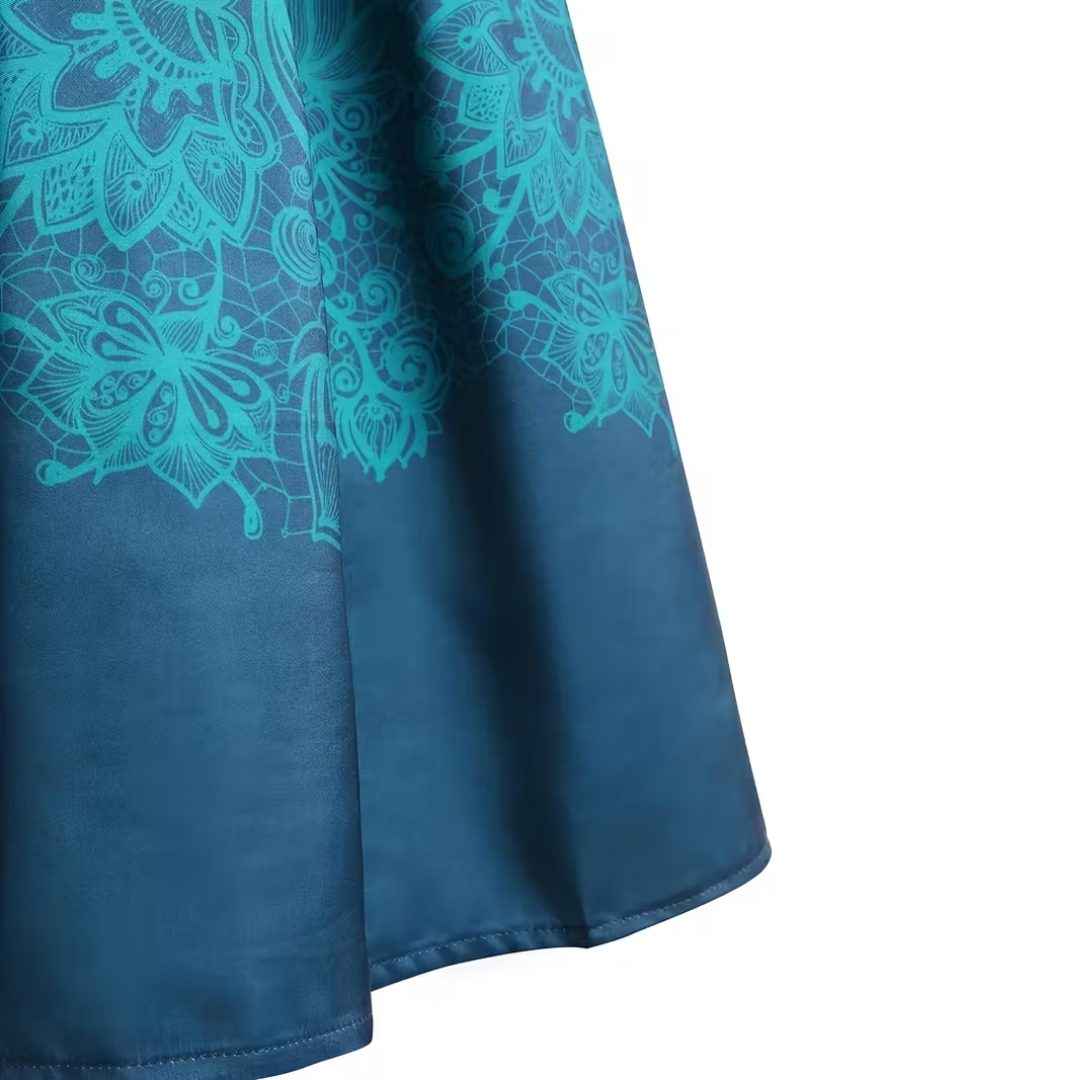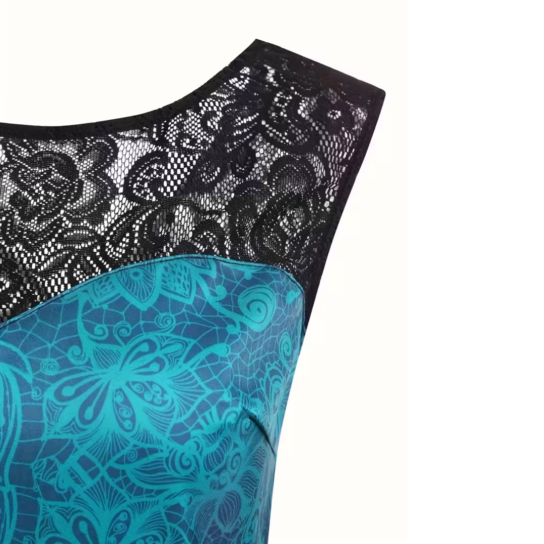 urn heads without trying too hard. This vintage-inspired beauty pairs a rich teal print with a black lace neckline for just the right balance of sweet and sultry. The pleated flared skirt moves like a dream — think cocktails, weddings, or anywhere you want to feel like the main event.