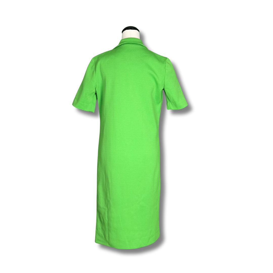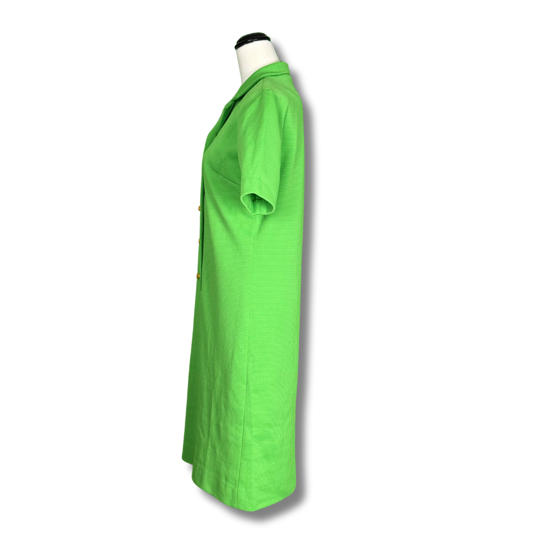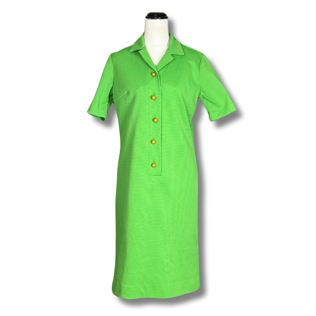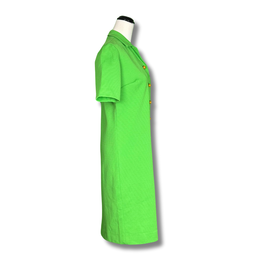 - Add a pop of color to your wardrobe with this bright lime 70s dress from Mr Fine, made from high-quality polyester. Featuring short sleeves and a mid length, this knit shirt-dress is designed with bust darts, a fold over collar, and a button front half placket for a classic and sophisticated look.