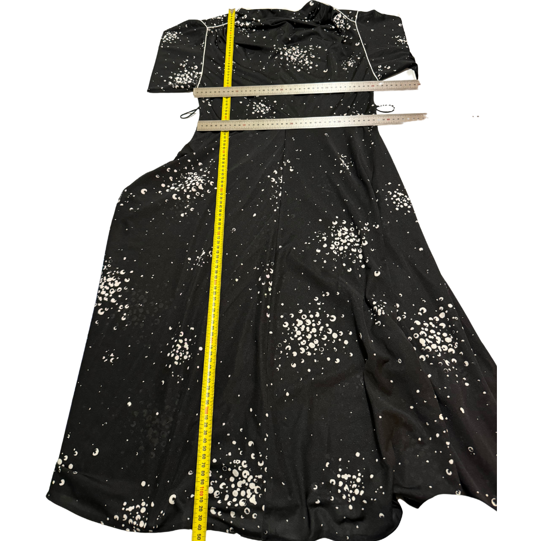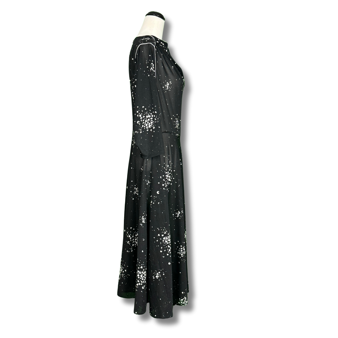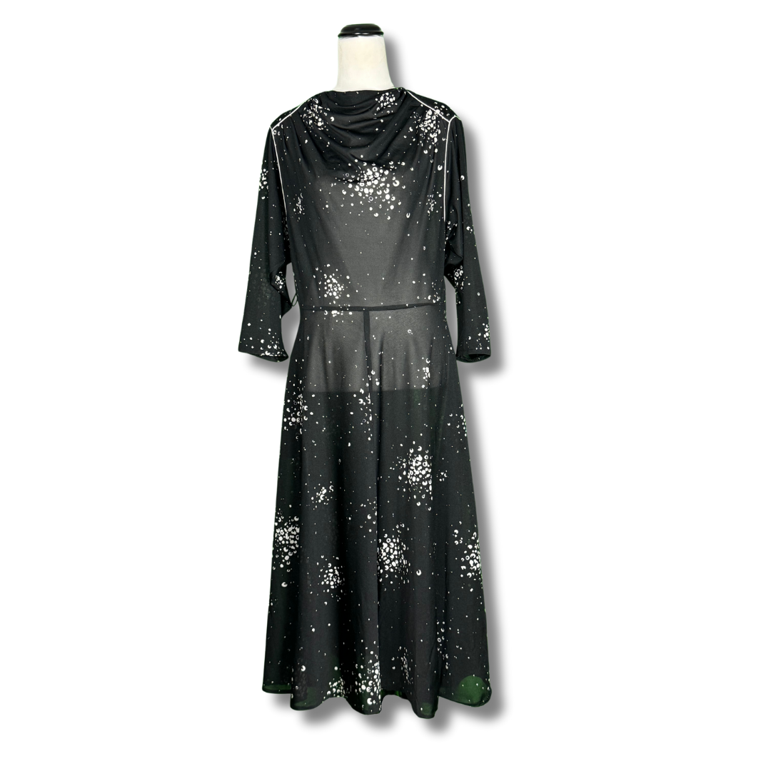 This vintage dress, made of 100% polyester, features a sheer fabric and a secretary style, complete with blousy long sleeves. With its mid length, it exudes a timeless elegance.