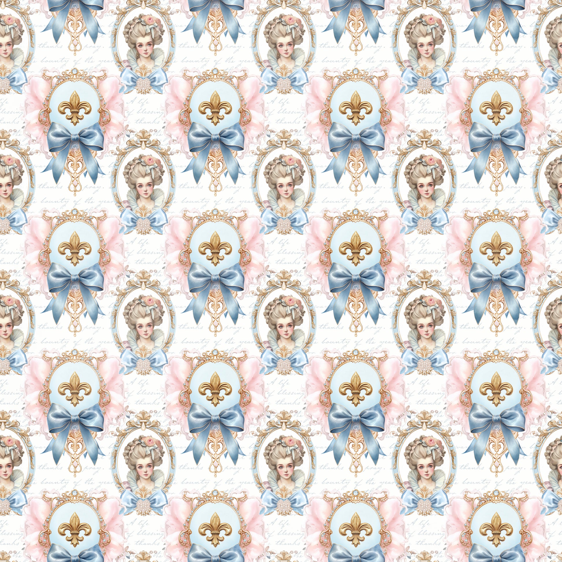 An opulent pastel dream of powder-blue bows, blushing pink ribbons, and the queen of hearts herself — Marie Antoinette. This print is all sugared whispers and rococo flirtation, like a love letter written in frosting. Perfect for anyone whose love language is luxury.