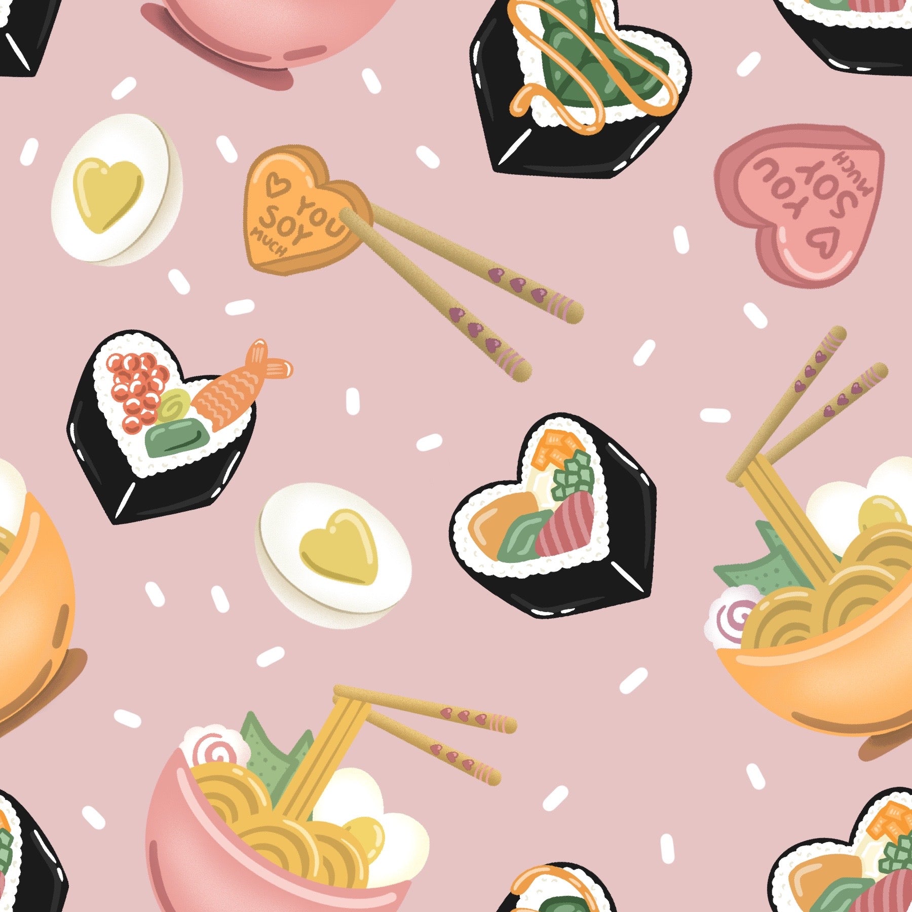 Your new comfort print: heart-shaped sushi, warm ramen bowls, and candy hearts that say everything you wish you could text. Soft colours, cozy vibes, and maximum adorable chaos.